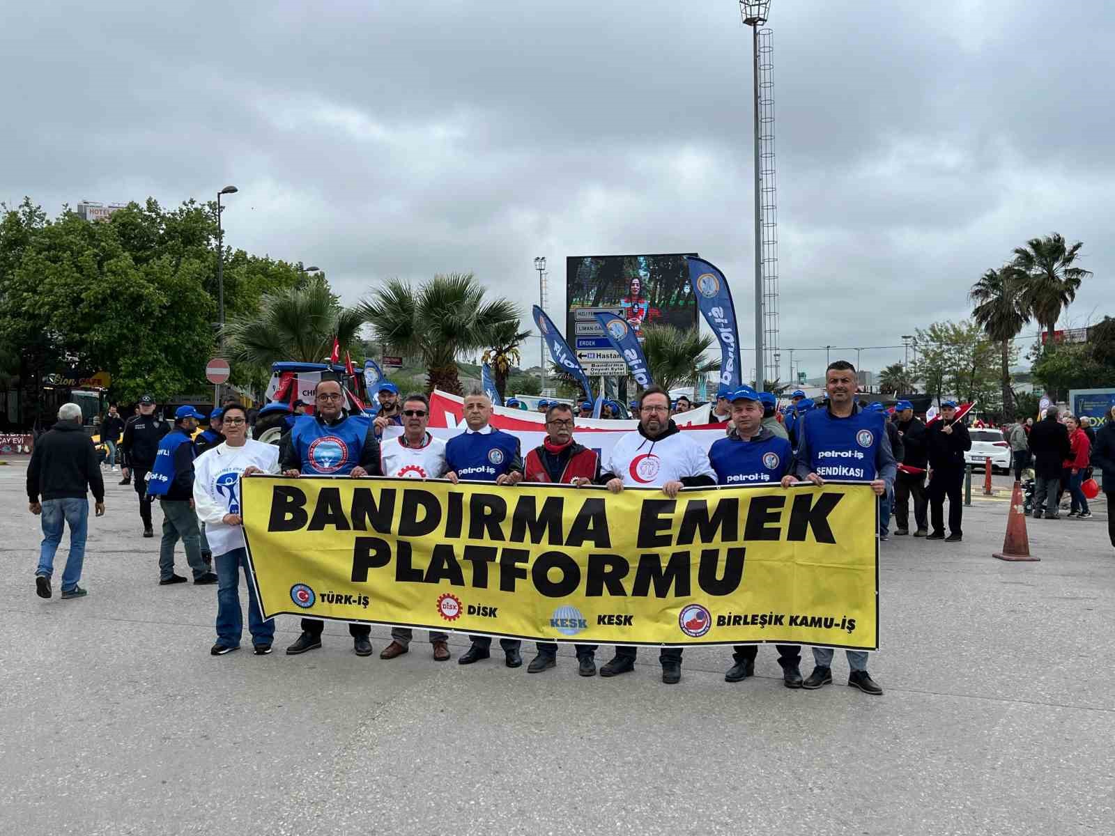 Bandırma’da düzenlenen “1 Mayıs İşçi Bayramı” kutlamaları İstanbul Deniz Otobüsü (İDO) iskelesi önünde başladı. Sendikalar ve işçi gruplarından oluşan kalabalık, sloganlarla etkinlik alanı olan Cumhuriyet Meydanı’na yürüdü. Tüm grupların meydandaki yerlerini almalarının ardından saygı duruşunda bulunuldu ve İstiklal Marşı okundu. Günün anlam ve önemini belirten konuşmayı, Bandırma Emek Platformu Dönem Sözcüsü ve Petrol İş Sendikası Bandırma Şube Başkanı Tuncay Topuz yaptı.