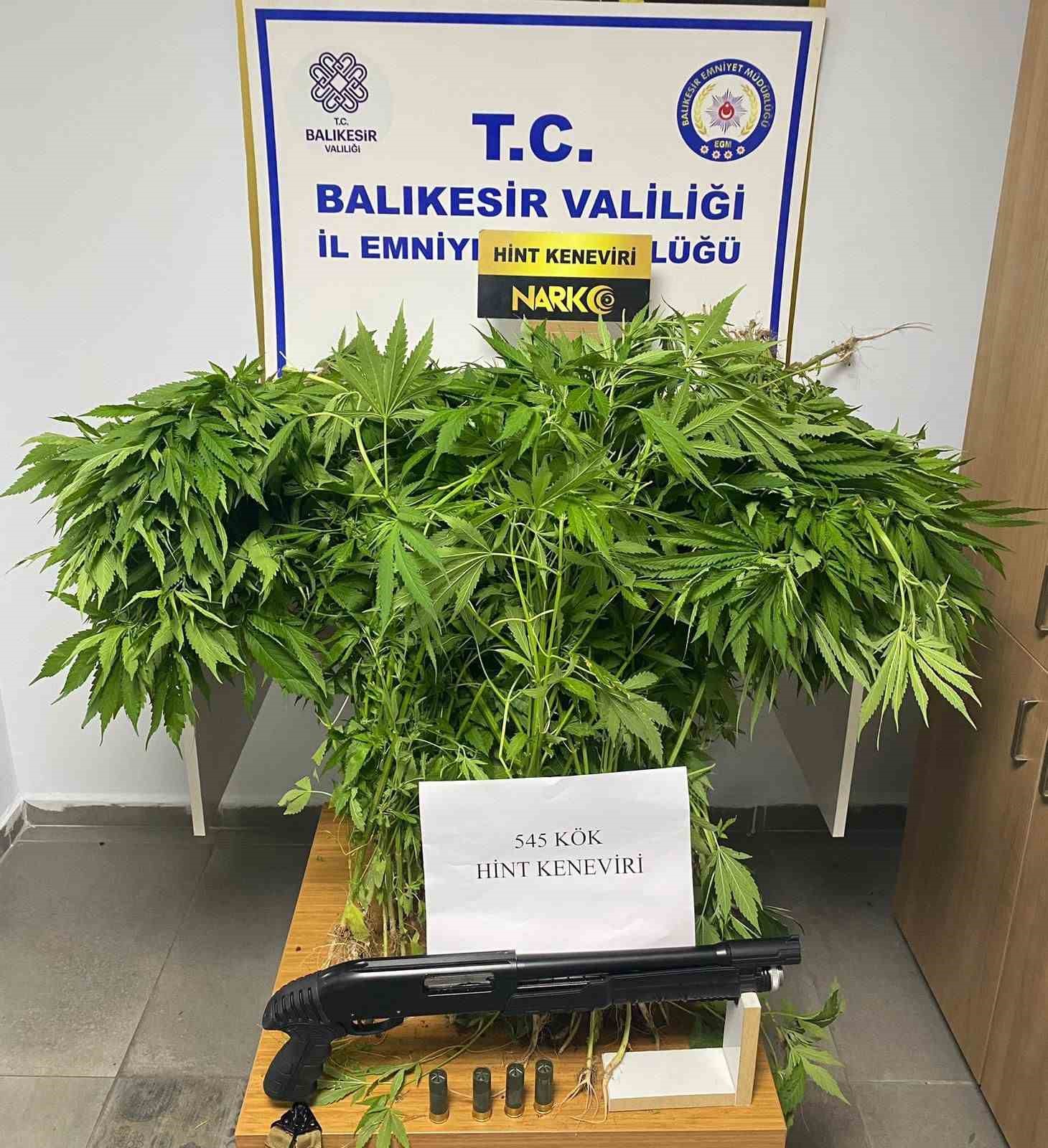 Balıkesir’in Ayvalık ilçesinde bir eve düzenlenen uyuşturucu operasyonunda 545 kök Hint keneviri ile ruhsatsız tüfek ele geçirildi.