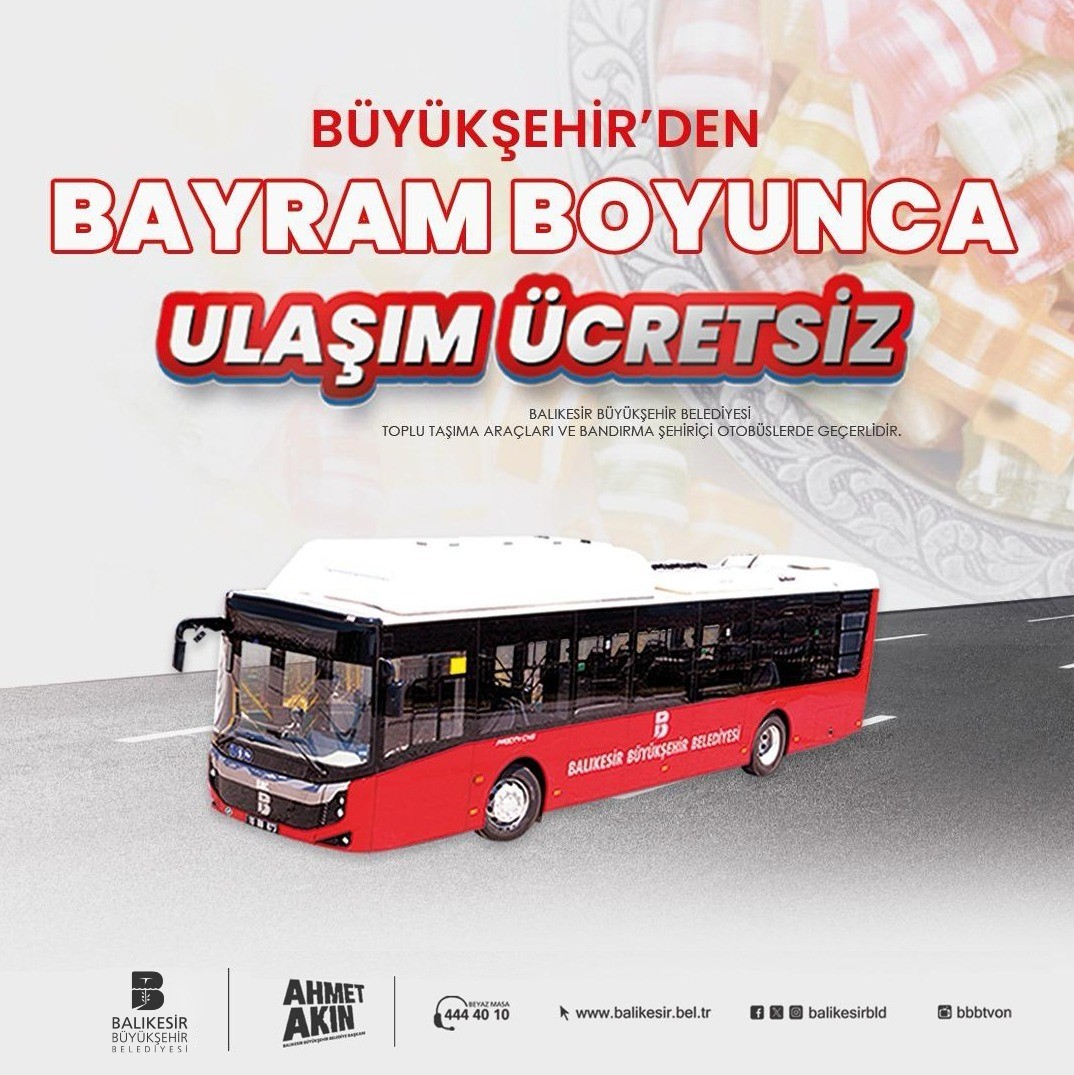 Balıkesir Büyükşehir Belediyesi iştiraki Balıkesir Toplu Taşıma AŞ’ye ait toplu taşıma araçlarında ve Bandırma şehir içi otobüslerinde üç günlük Ramazan Bayramı süresince ulaşım ücretsiz olacak. Balıkesir Büyükşehir Belediye Başkanı Ahmet Akın’ın aldığı karar doğrultusunda 10 Nisan Çarşamba günü başlayacak ücretsiz ulaşım, 12 Nisan Cuma günü sona erecek. Yolcular bayram süresince Balkartlarını geçiş cihazına okutmadan gidecekleri yere ücretsiz olarak ulaşacak.