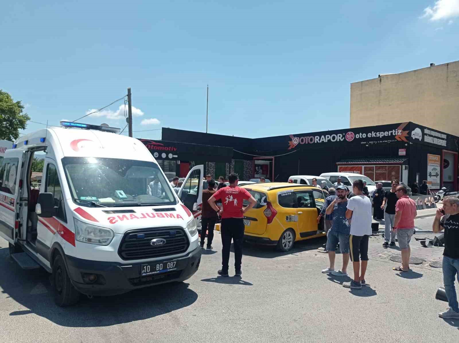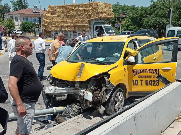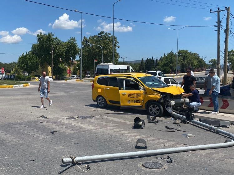 Balıkesir’in Gönen ilçesinde bir ticari taksi sürücüsü direksiyon başında rahatsızlanarak kontrolünü kaybetti. Ticari taksi, bir minibüs ve yayalara çarptıktan sonra trafik ışığına çarparak durabildi.