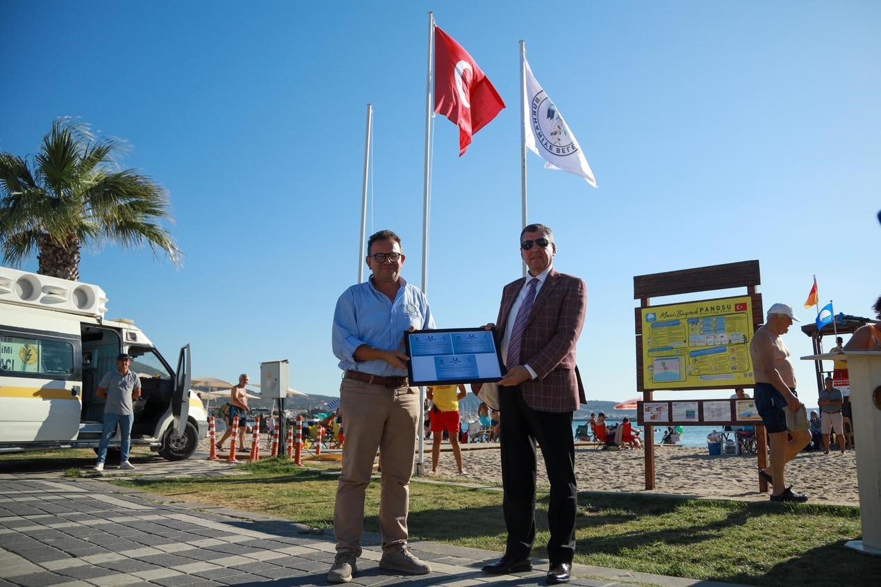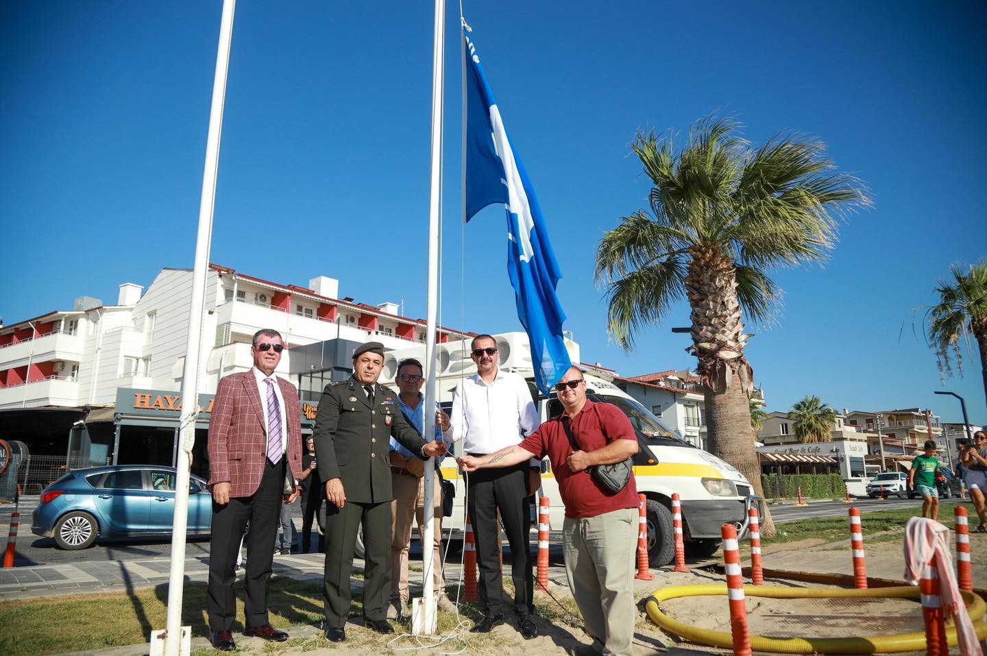 Mavi bayrak töreninde TÜRÇEV İzmir ve Kuzey Ege illeri Şubesi Koordinatörü Yetkin Karabinalı’nın nezaretinde getirdikleri mavi bayrağı Belediye Başkan Vekili Tarık Erdil’e teslim etti.