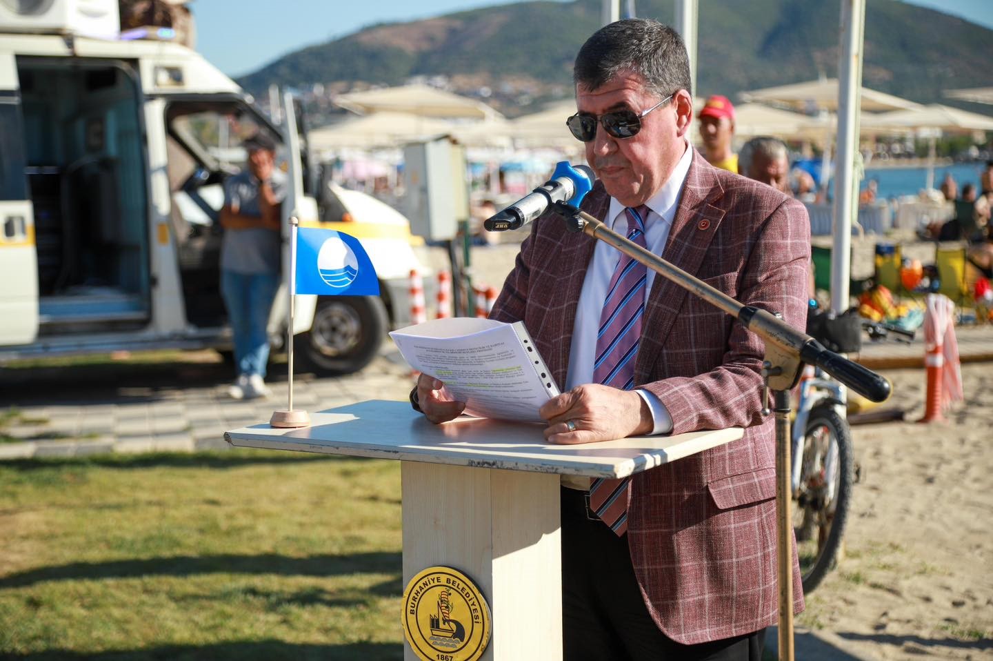 Program Saygı Duruşu ve İstiklal Marşı ile başlayıp, Belediye Başkan Vekili Tarık Erdil’in konuşmasıyla devam etti: “Mavi bayrak, gerekli standartları taşıyan nitelikli plaj ve marinalara verilen uluslararası bir çevre ödülüdür. Temiz, bakımlı, donanımlı güvenli ve dolayısıyla uygar, sürdürülebilir bir çevrenin sembolüdür.